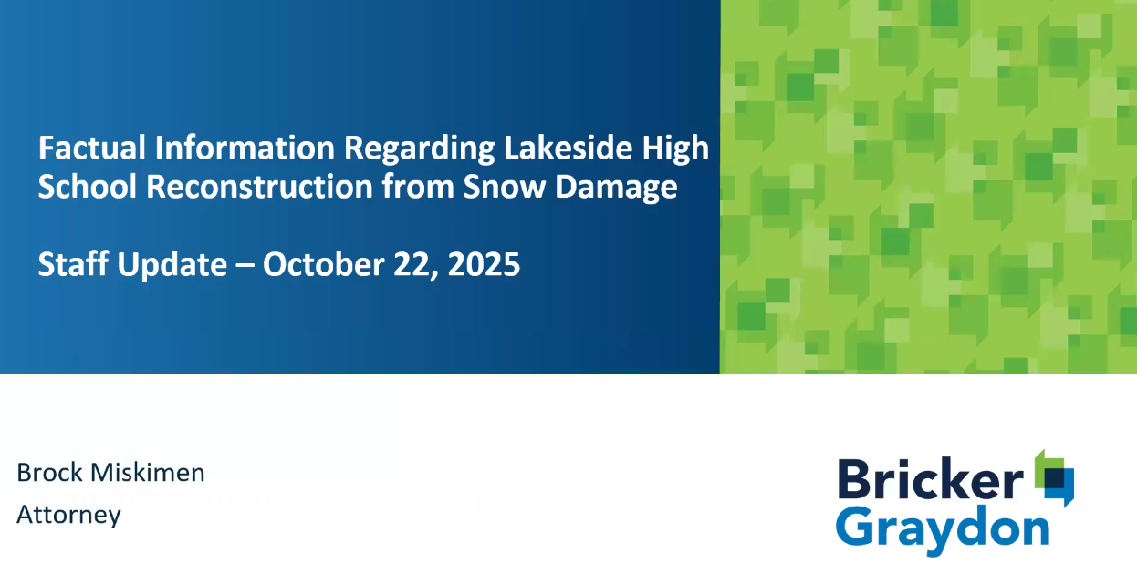 - The district has met with the Ohio Facilities Construction Commission to request assistance. The district was advised to follow-up with OFCC once the insurance matter is settled.